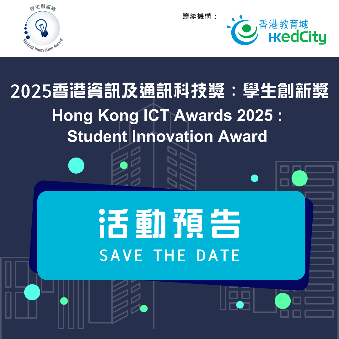 Hong Kong Education City (EdCity) will soon organise the Hong Kong ICT Awards 2025: Student Innovation Award. Students are cordially invited to apply for the award, so that they can give full play to their creativity and knowledge of information and communications technology (ICT) and come up with solutions that are conducive to the development of our society.