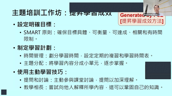 黄健威先生为参加者分享与「提升学习成效」主题,并提供了多个实际应用的例子,更为参赛学生们提供了不少实用的参赛贴士。