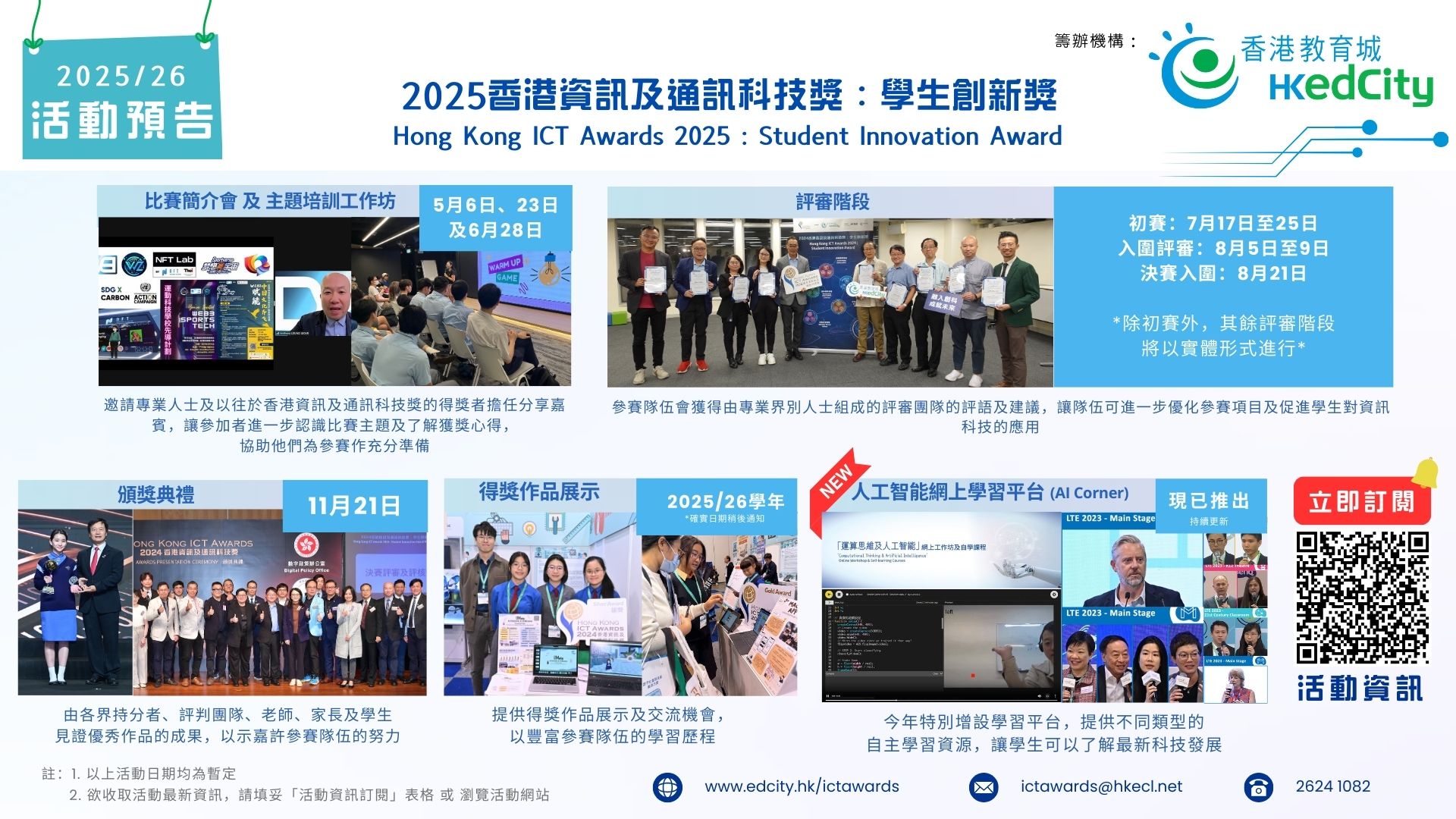 欲收取活动最新资讯,请填妥「活动资讯订阅」表格,或浏览网站 https://web.edcity.hk/zh-hans/ictawards/home/ 。